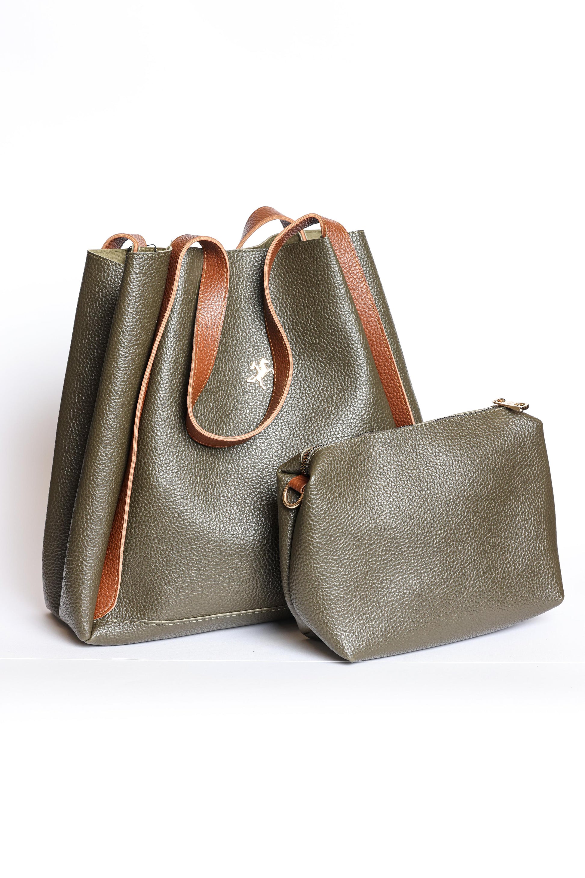 This elegant BUCKET CHARM includes a spacious bucket-style handbag and a matching pouch, both crafted from premium textured leather. The main bag features a sophisticated olive green tone contrasted beautifully with tan brown straps and trims, creating a timeless and versatile look suitable for all seasons.